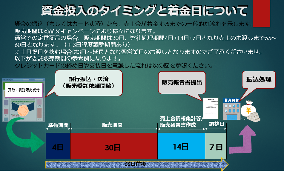 通常での定番商品の場合、販売期間は30日、弊社処理期間4日+14日+7日となり売上のお渡しまで55〜60日ほどとなります。(+3日程度調整期間あり)